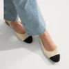 - Soft, flexible upper in ivory and black captoe with an almond-toe profile.