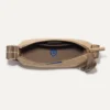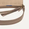 - Adjustable crossbody strap in a greyish-brown with a tan floating stitch