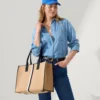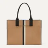 - Boxy, lightweight design in light camel with two center stripes in black and ivory, and a secure zipper closure.