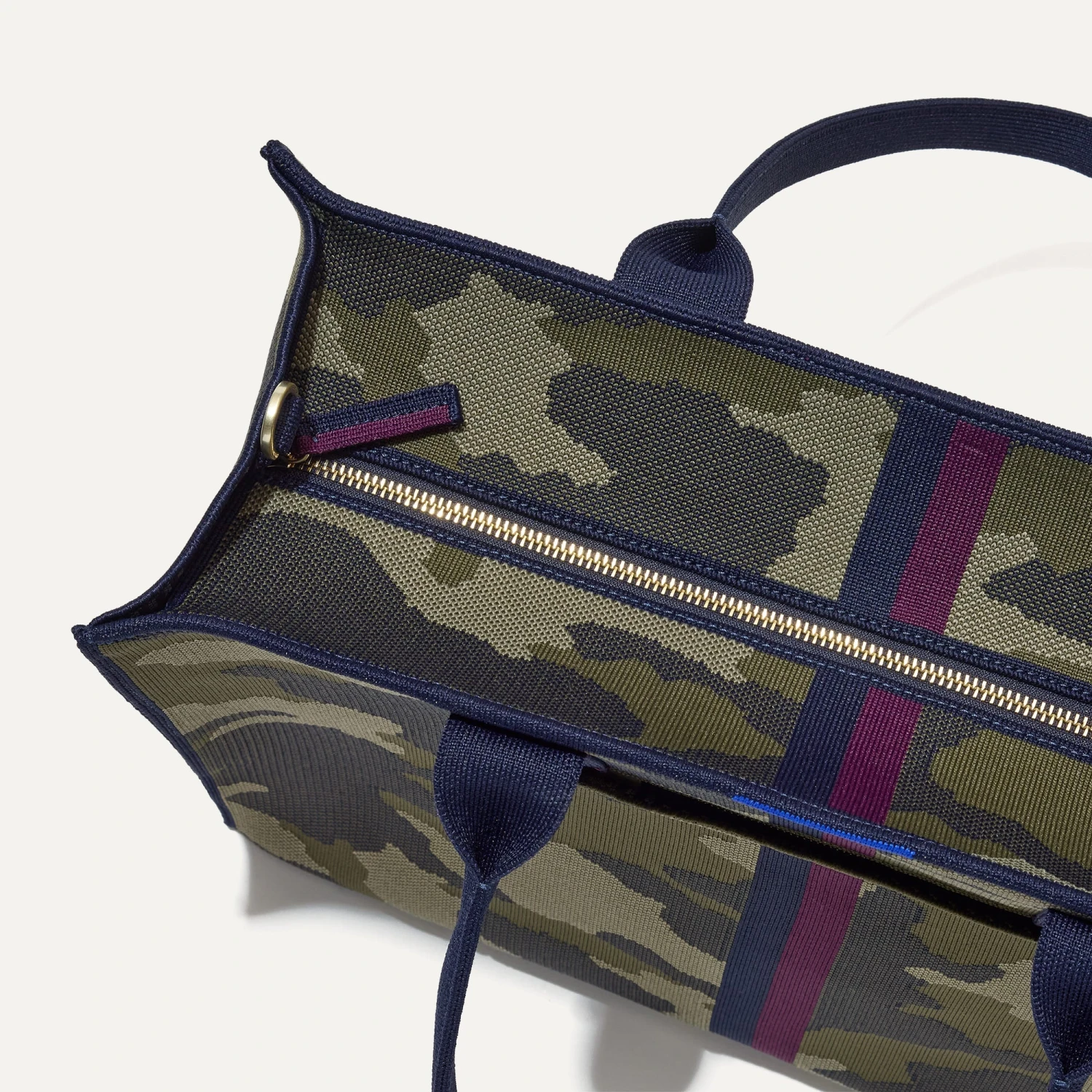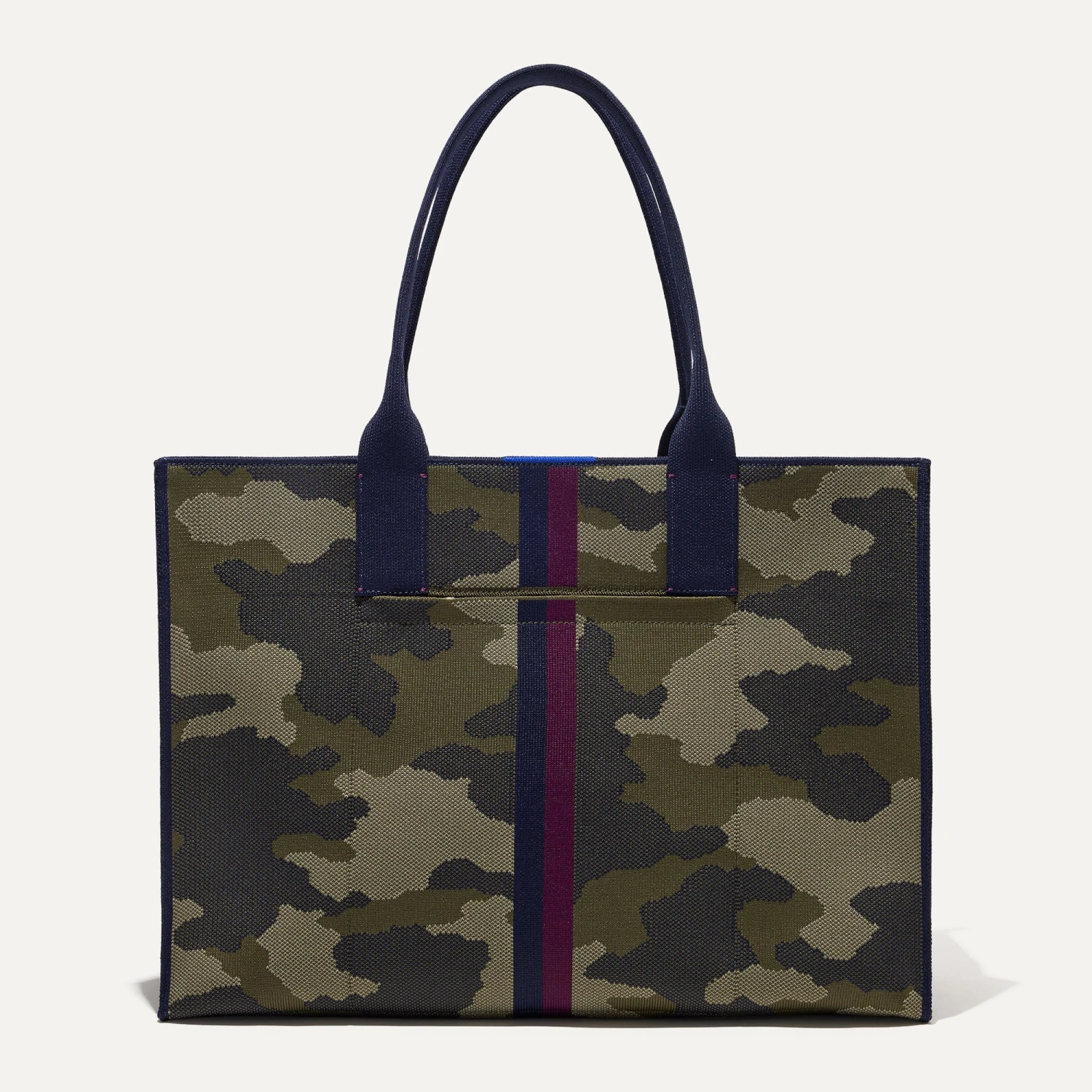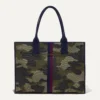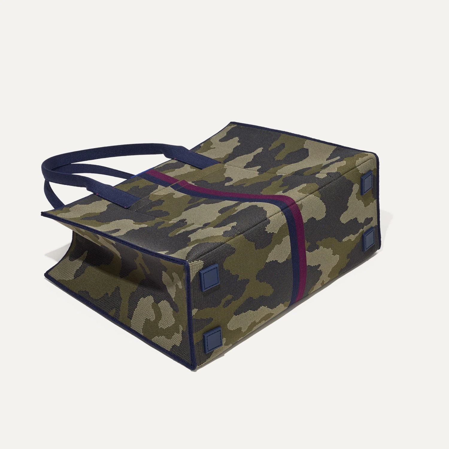 - Boxy, lightweight design in an olive camo pattern with navy and burgundy stripes.