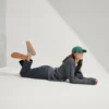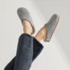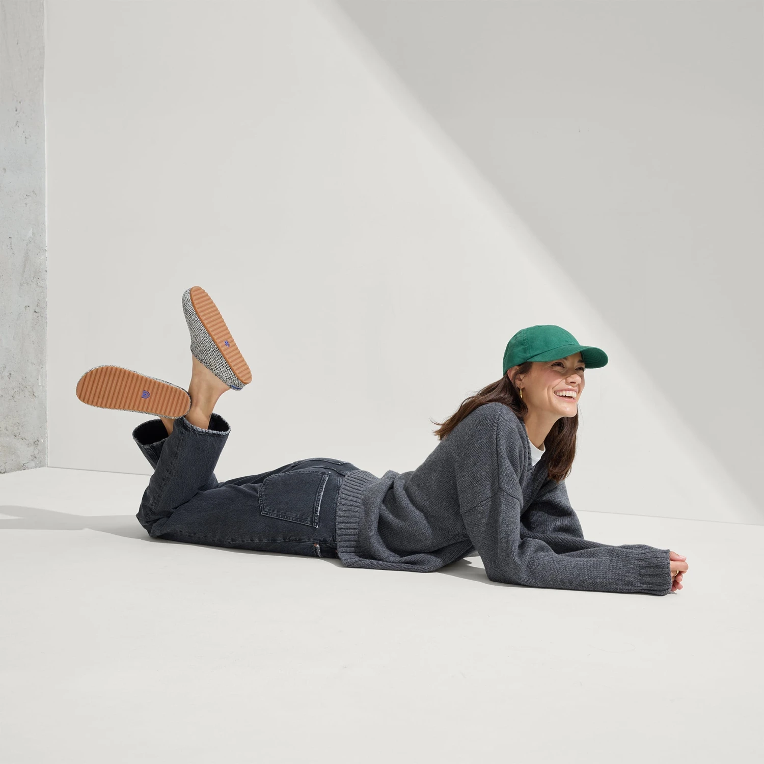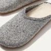 - Soft, V topline upper in a heathered black and grey bouclé texture.