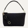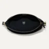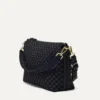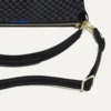 - Detachable, adjustable crossbody strap with an elevated saddle stitch detail in black.