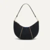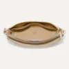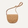 - Detachable, adjustable crossbody strap with an elevated saddle stitch detail in light brown.