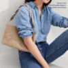 - Durable, removable top handle in light brown comfortably fits over the shoulder.