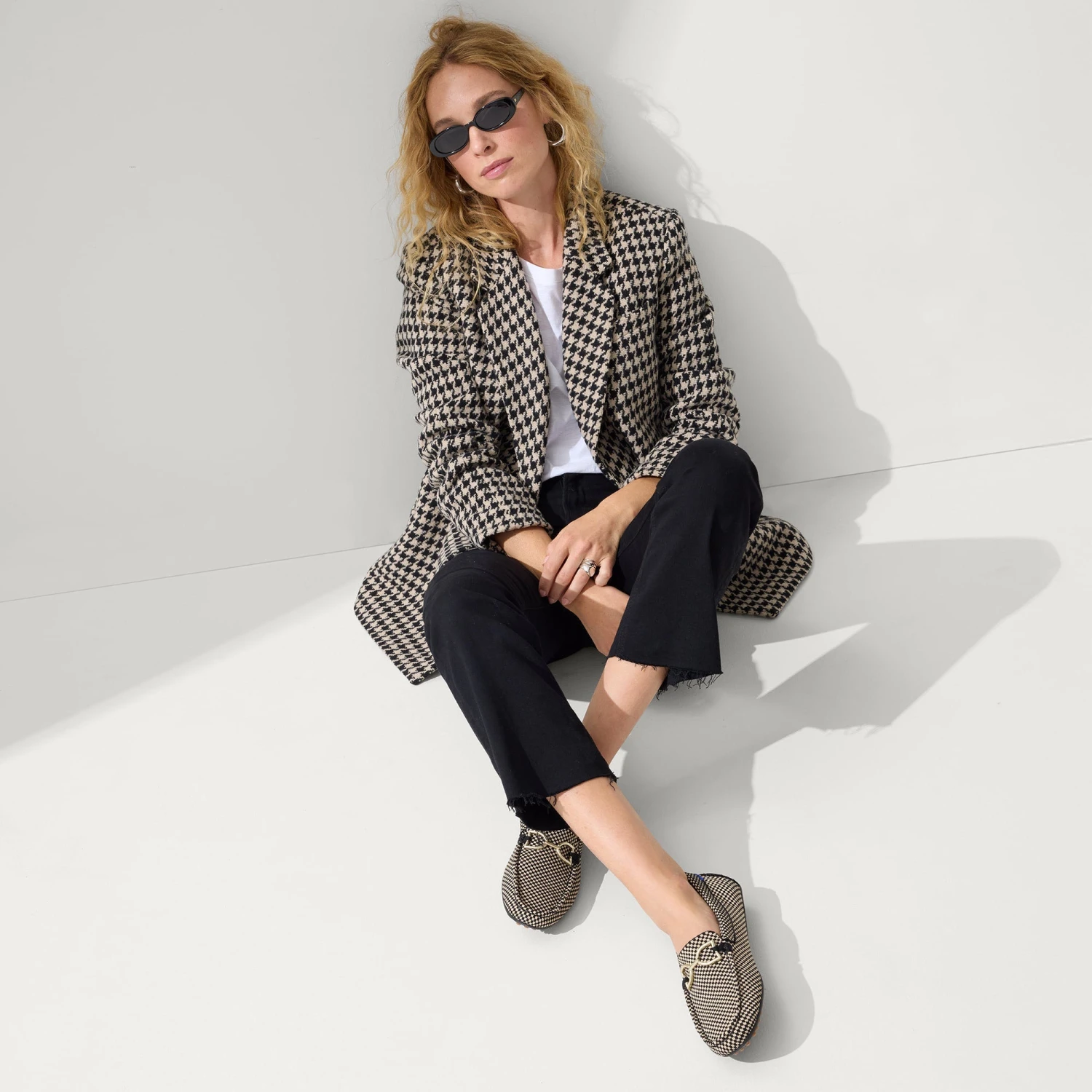 - Soft, flexible upper in an ivory and black micro checkered pattern with a gold hardware signet bit on the vamp.