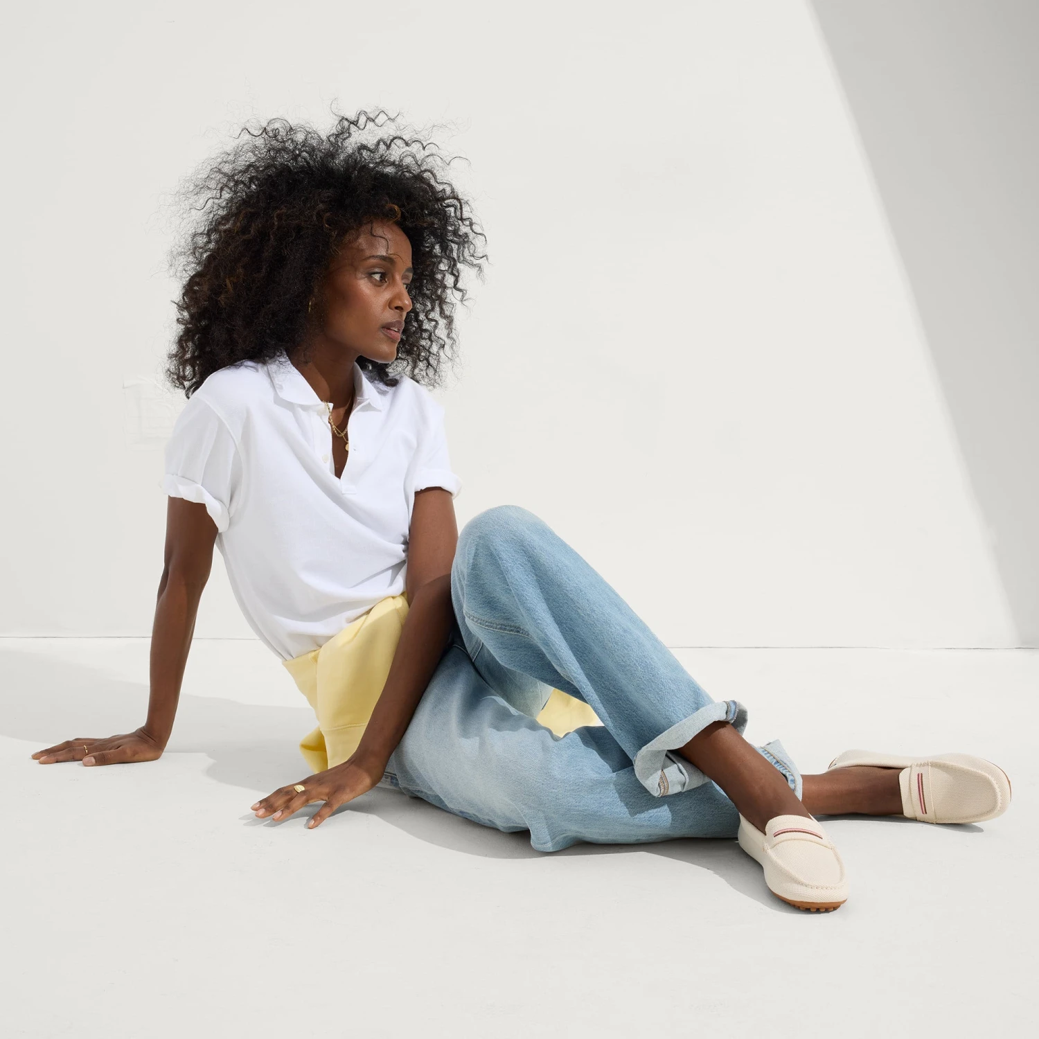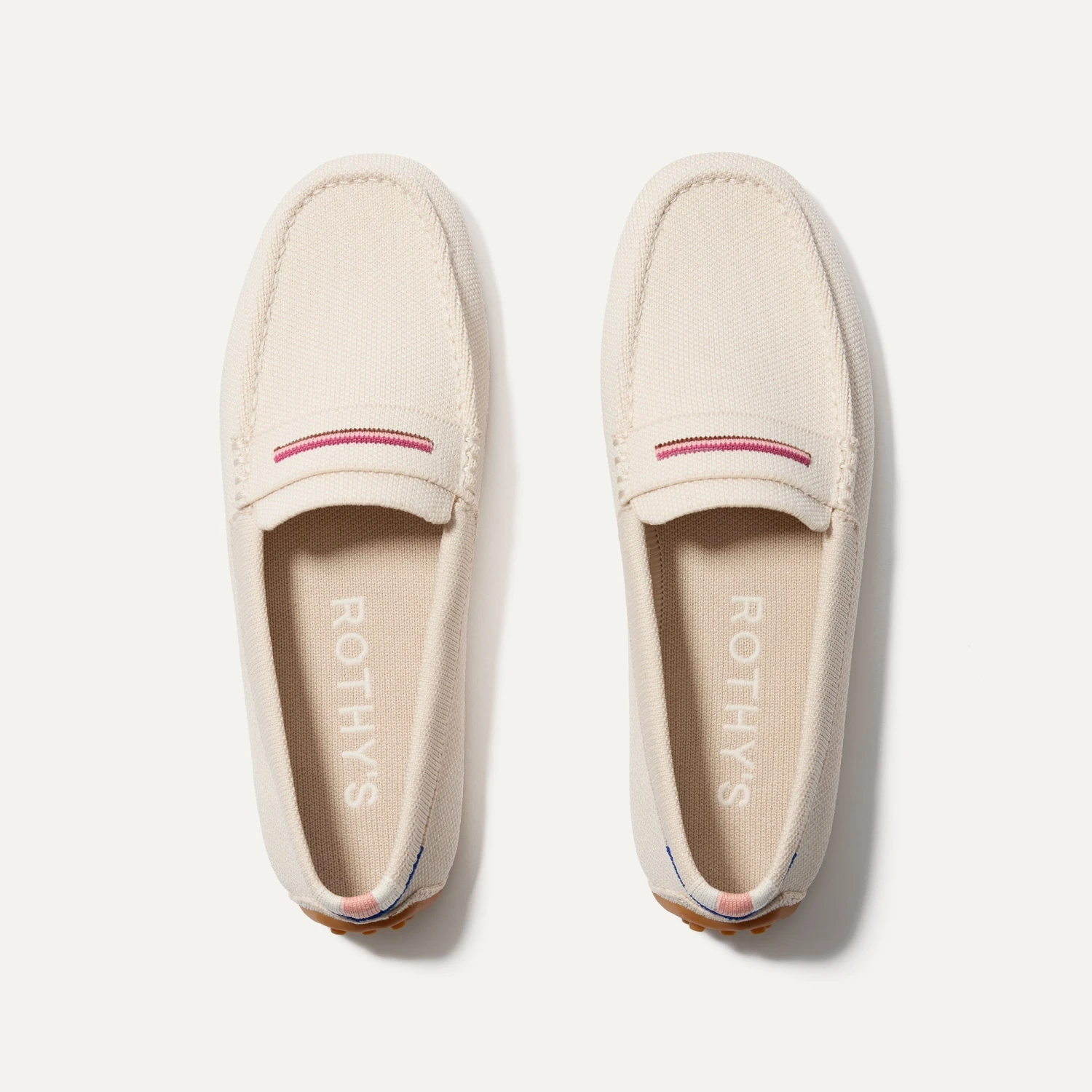 - Soft, flexible upper in ivory with a pink and brown penny stripe on the vamp.