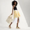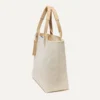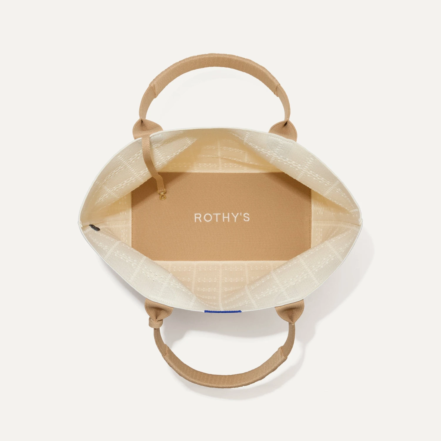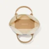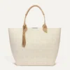 - Durable braided top handles in tan fit comfortably over the shoulder.