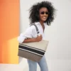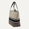- Durable top handles in black and cream stripes fit comfortably over the shoulder.