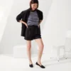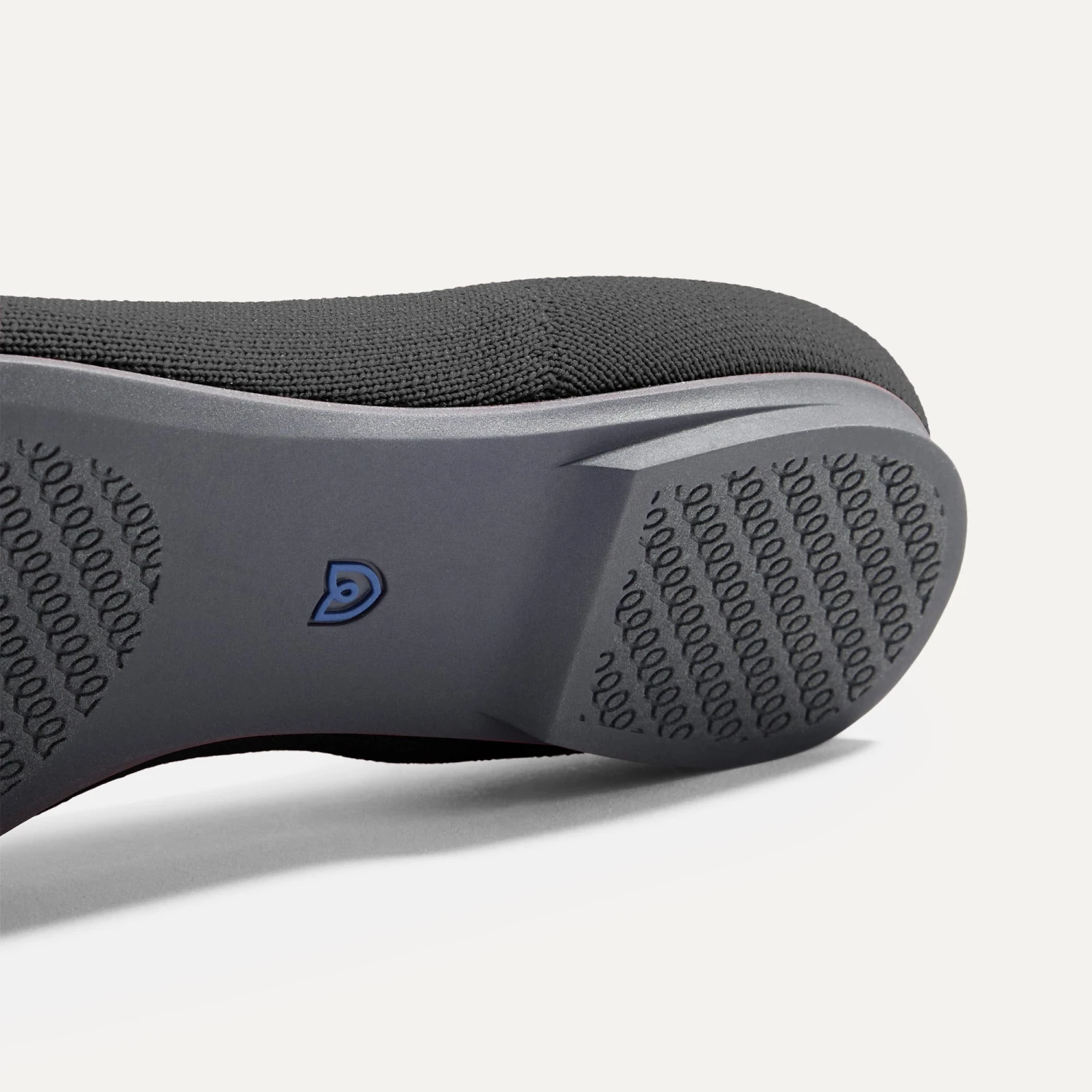 - Knit upper in black, with a Venetian vamp and rounded toe box.