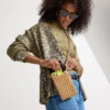 - Sleek, compact design in a camel brown basketweave pattern.