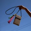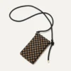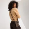 - Sleek, compact design in a black and camel brown basketweave pattern.