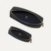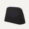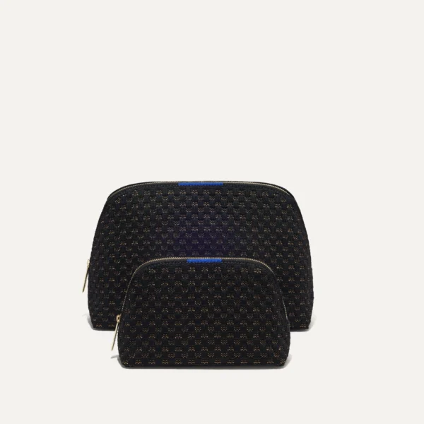 - Lightweight, structured style that keeps its shape. Small and large pouches come in a black and camel basketweave pattern.