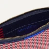 - Smooth zipper closure with a wrist strap in navy and red keeps your items secure.