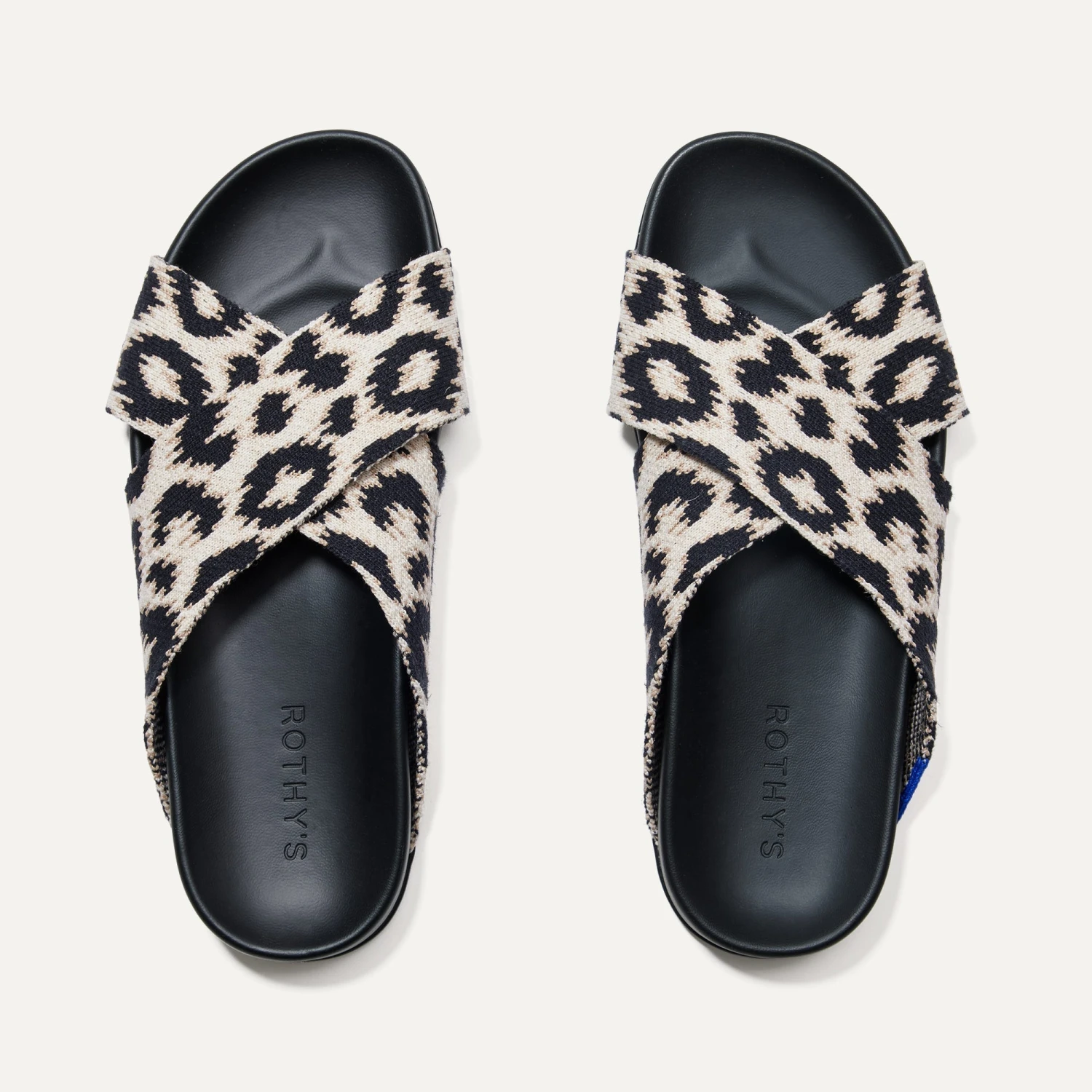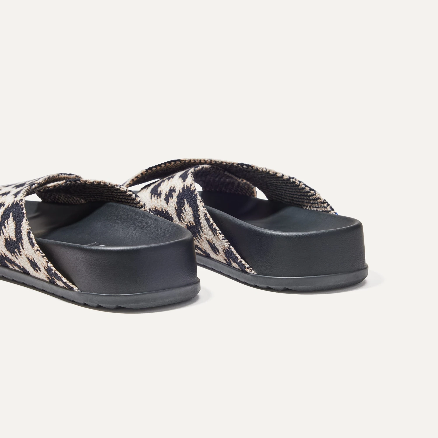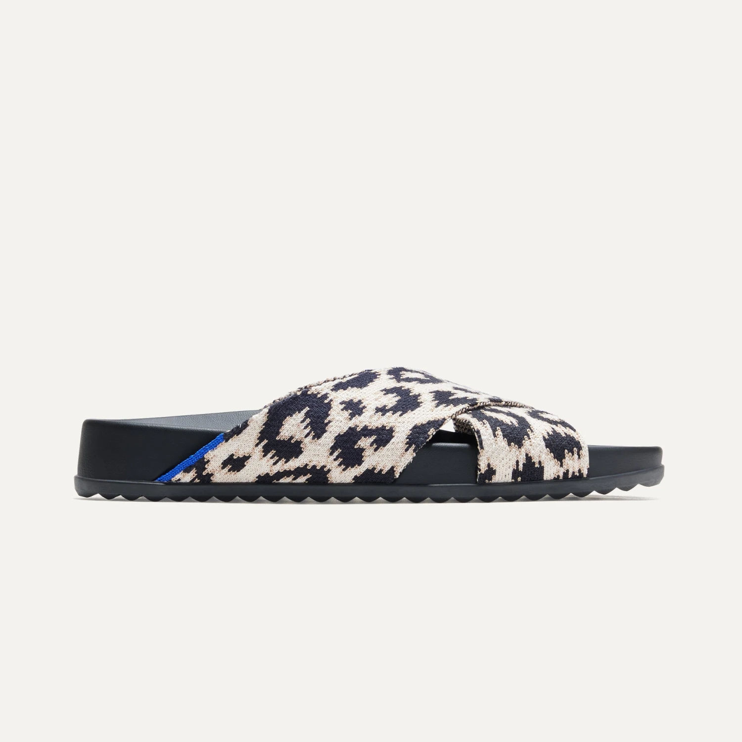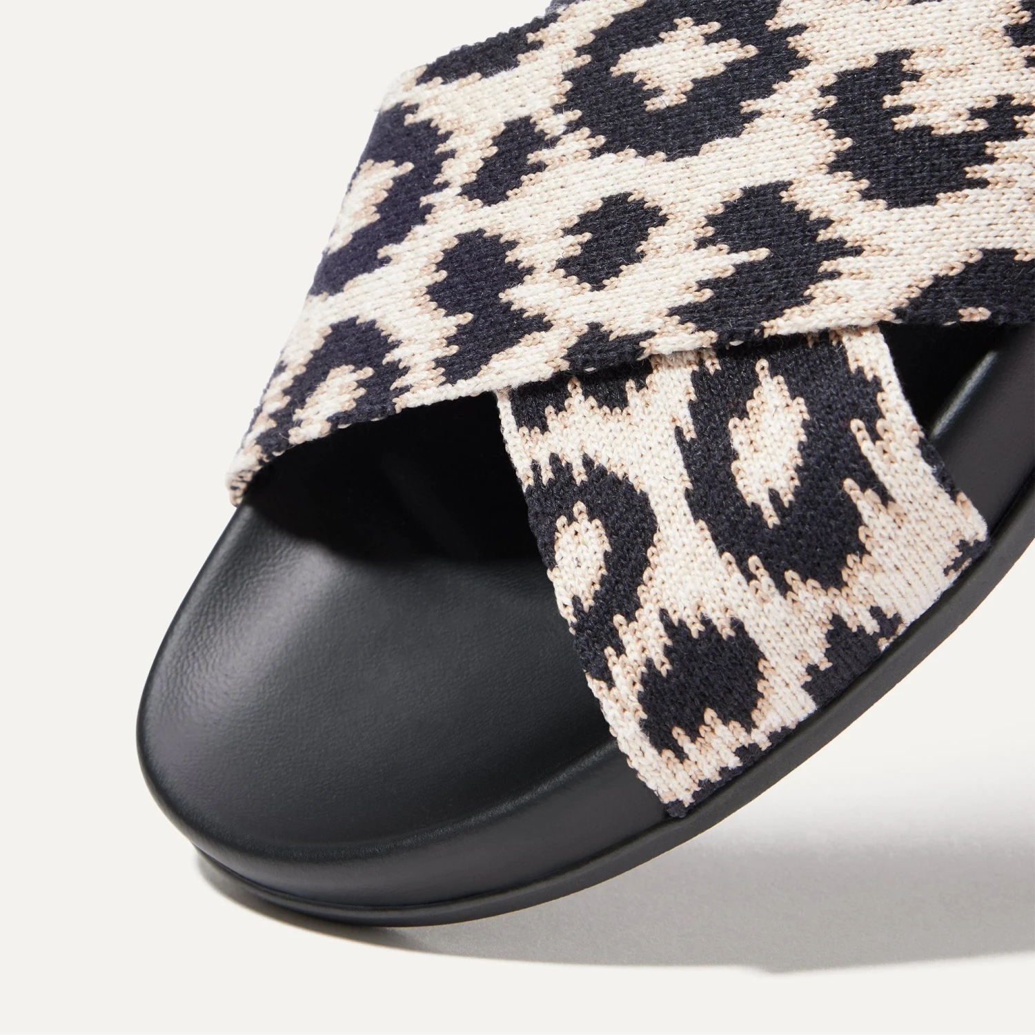- Flexible upper knit with natural, breathable hemp and features two wide crossing straps in cream and dark grey leopard print.