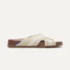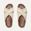 - Flexible upper in a natural hemp-textured weave with two wide crossing straps in ivory and tan.