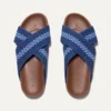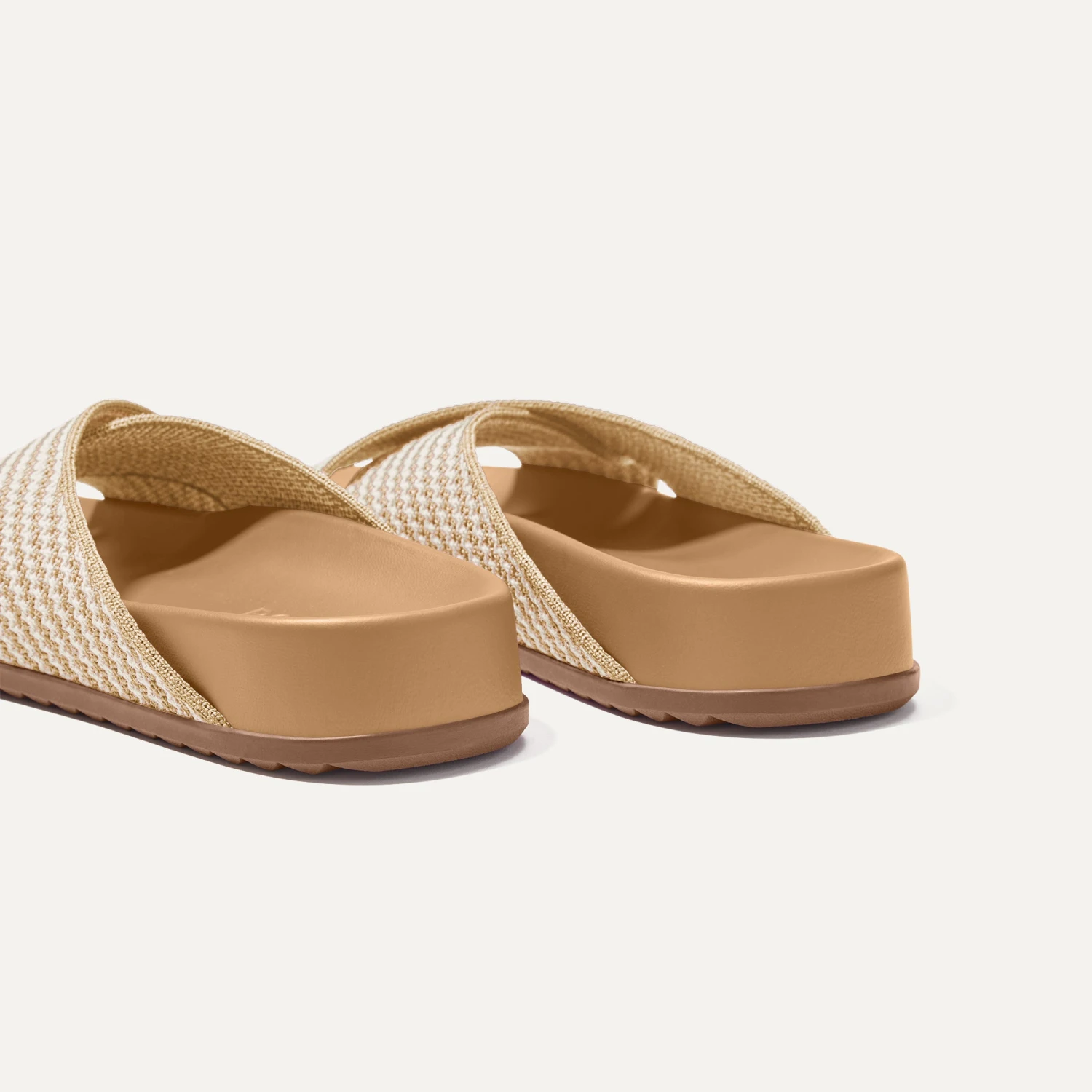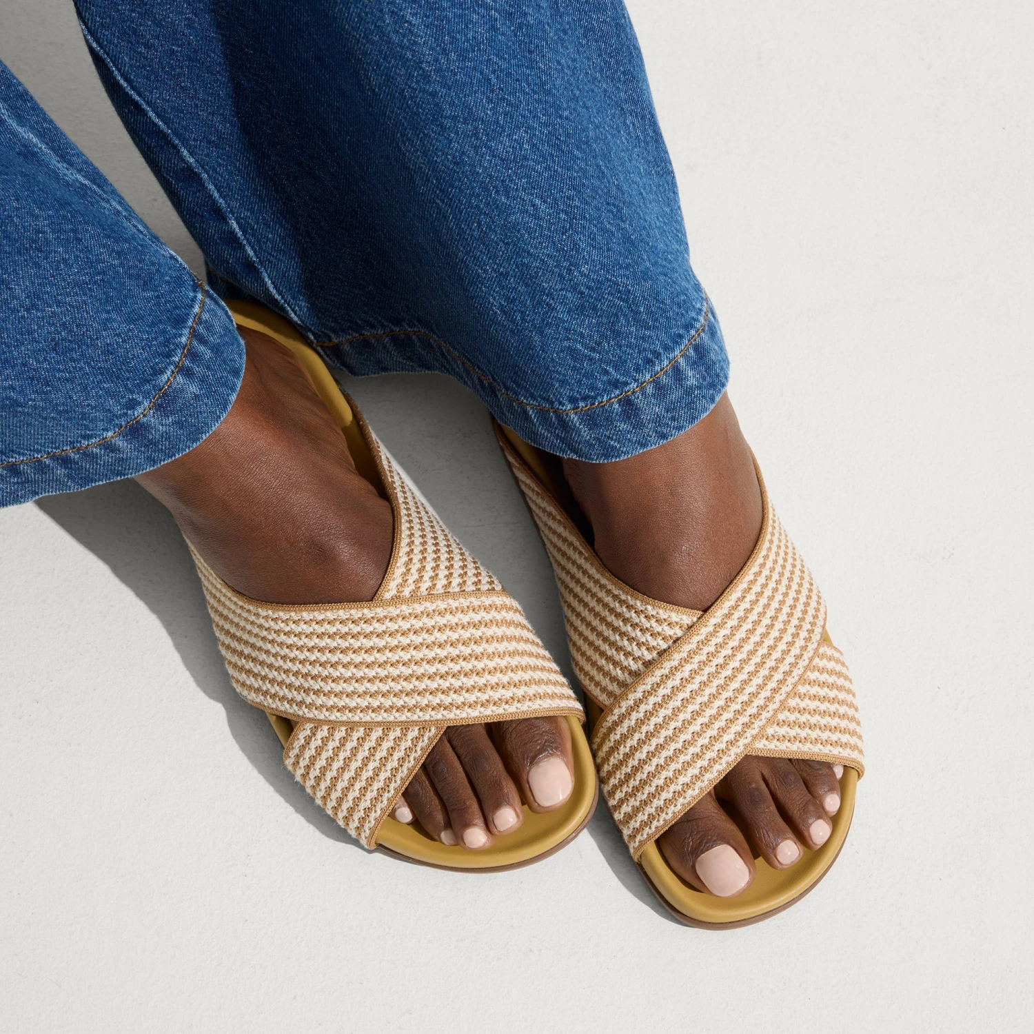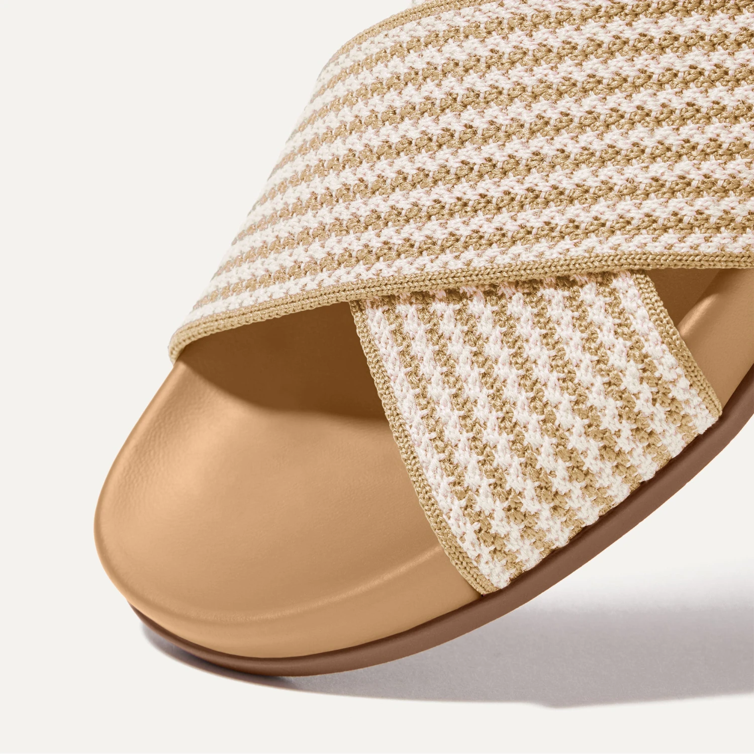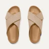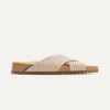 - Flexible upper knit with natural, breathable hemp and features two wide crossing straps in ivory and camel brown stripes.