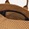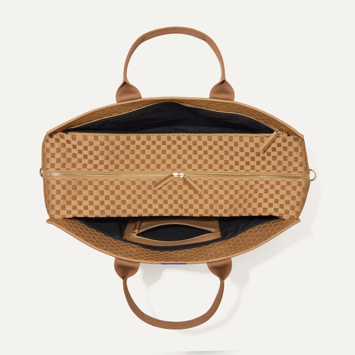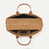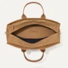 - Structured design in a camel brown basketweave pattern, with a double-zipper top closure and durable bag feet.