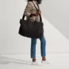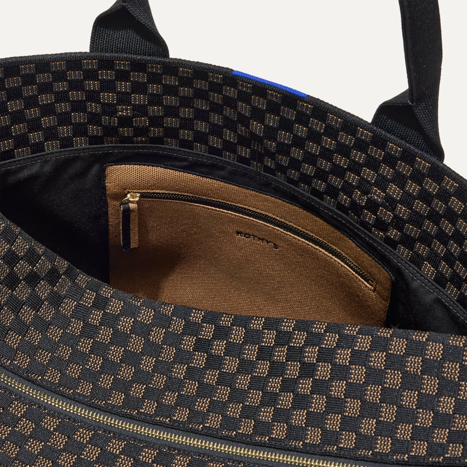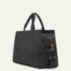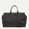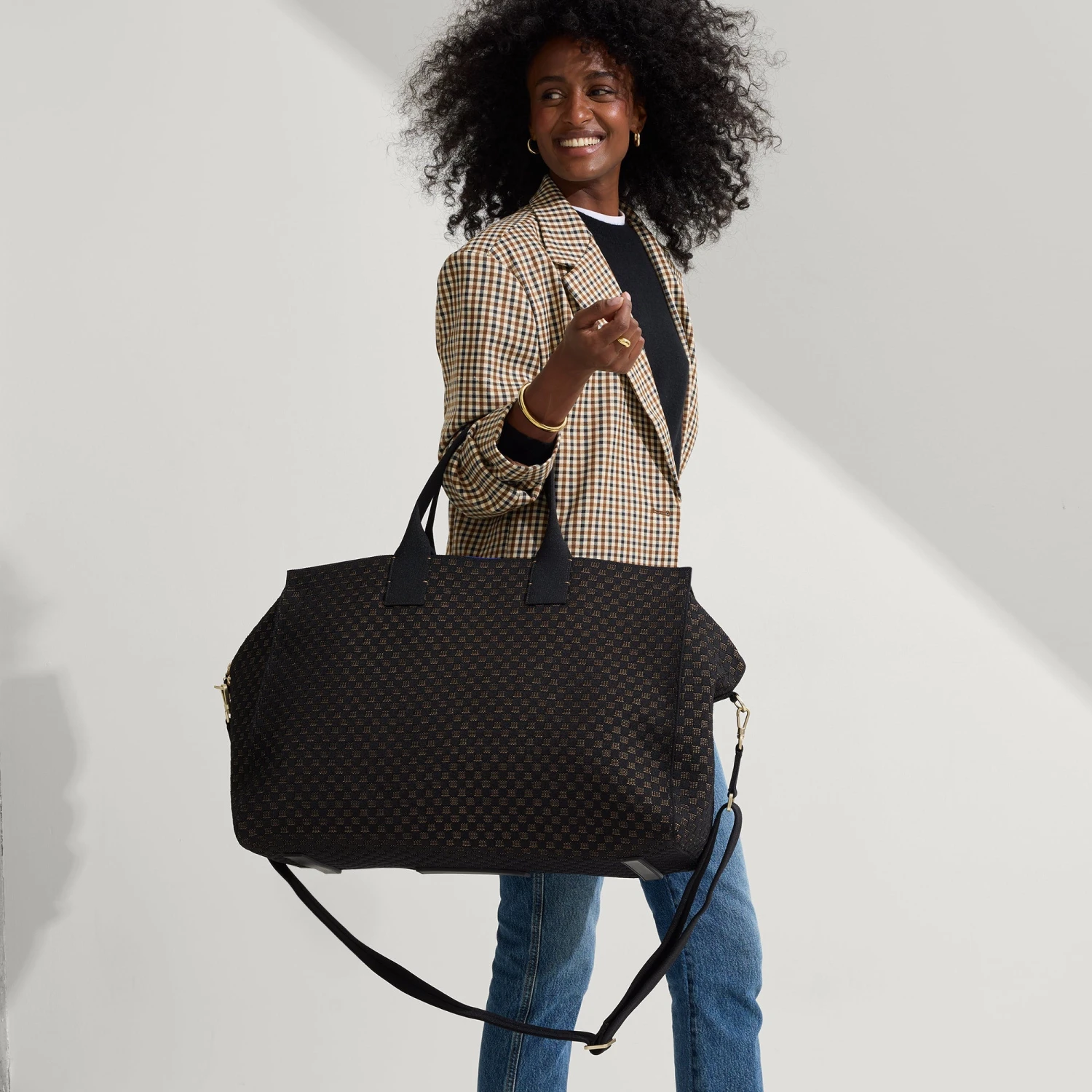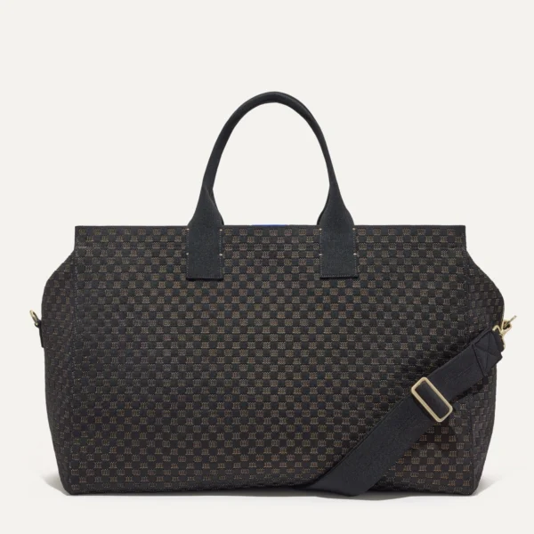 - Structured design in a black and camel basketweave pattern, with a double-zipper top closure and durable bag feet.