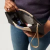 - Features a detachable wrist strap in light camel that easily wraps around the handles of any bag—or connects to the key leash of The Lightweight Tote for added organization.