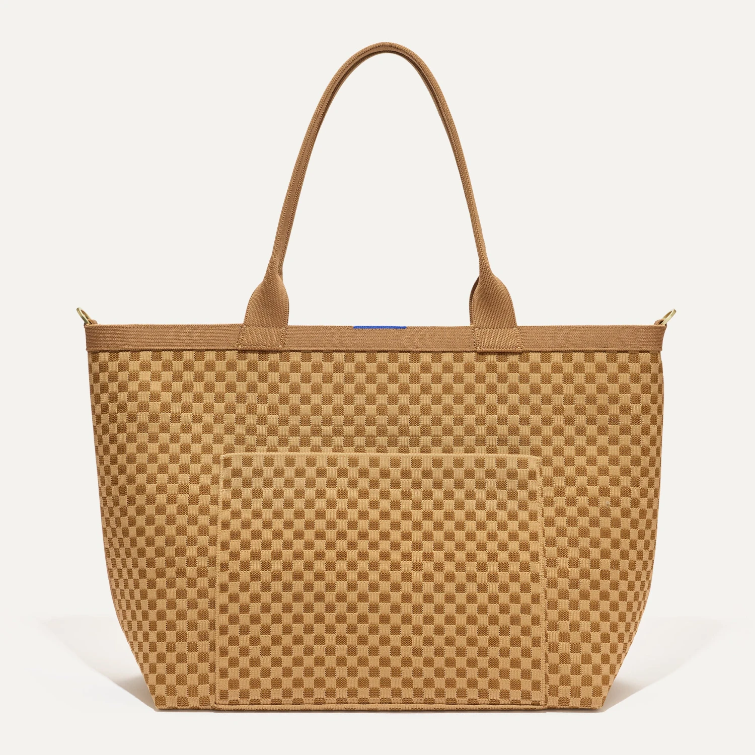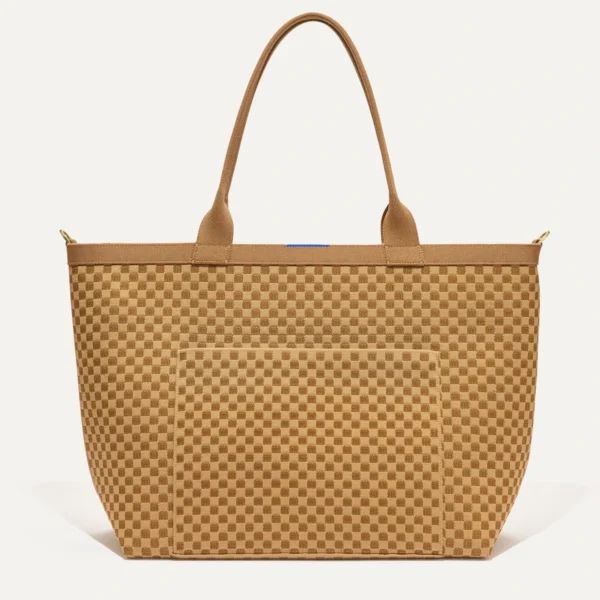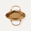 - Durable top handles in warm brown fit comfortably over the shoulder.